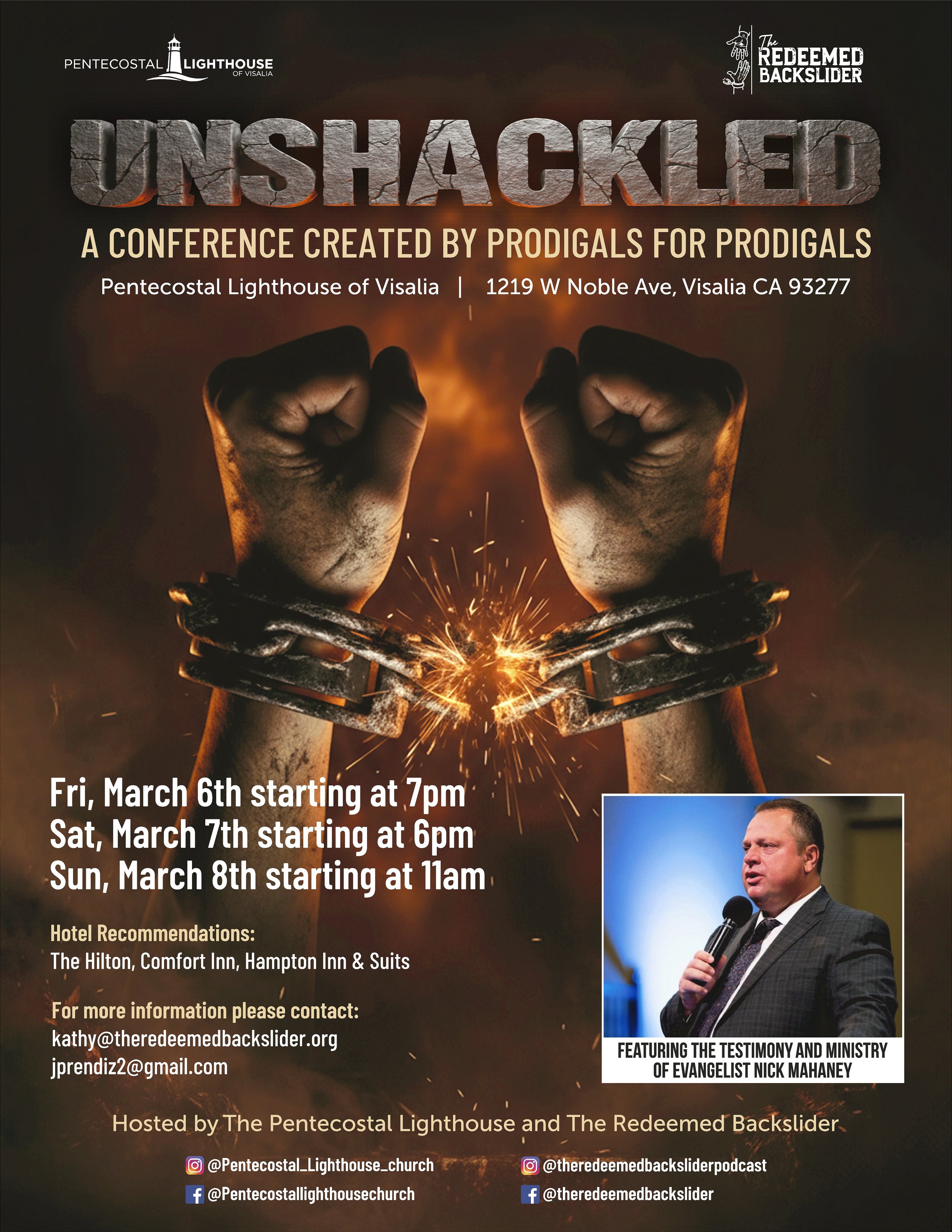 Join us Friday March 6th - Sunday March 8th, for Unshackled: A Conference Created By Prodigals For Prodigals. We are believing God for supernatural healing, deliverance, miracles and MORE!